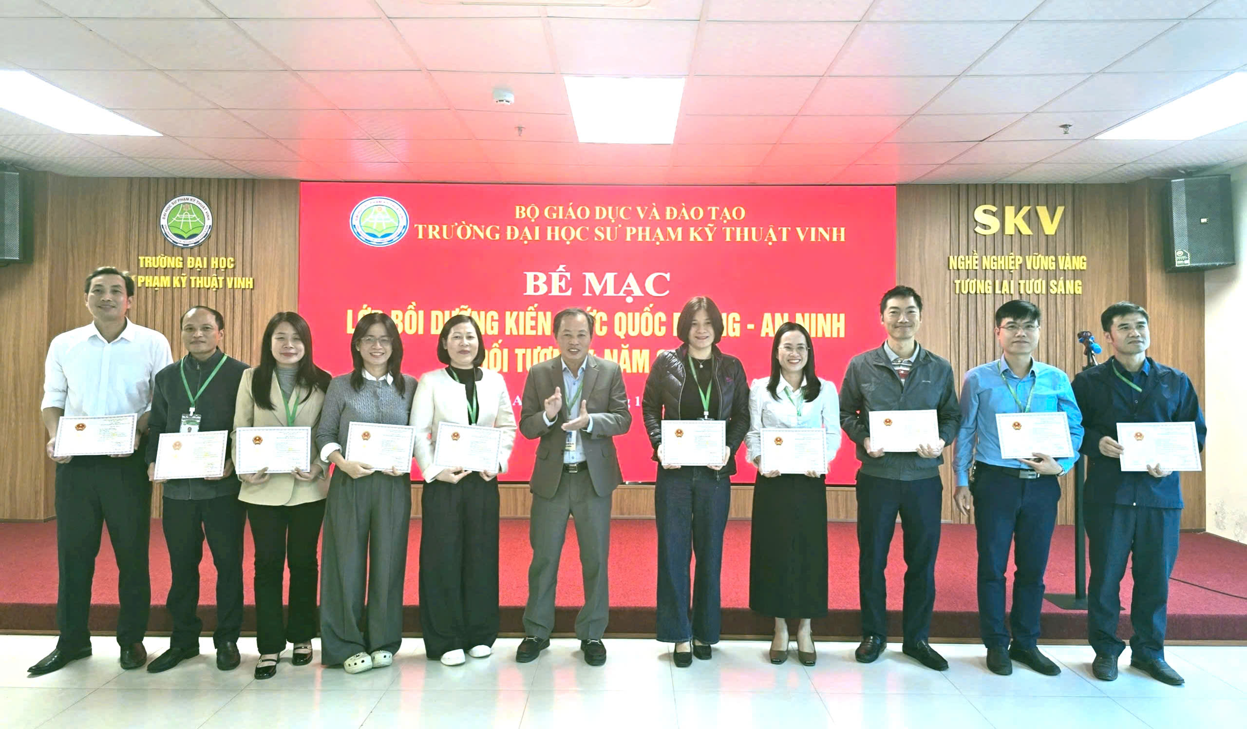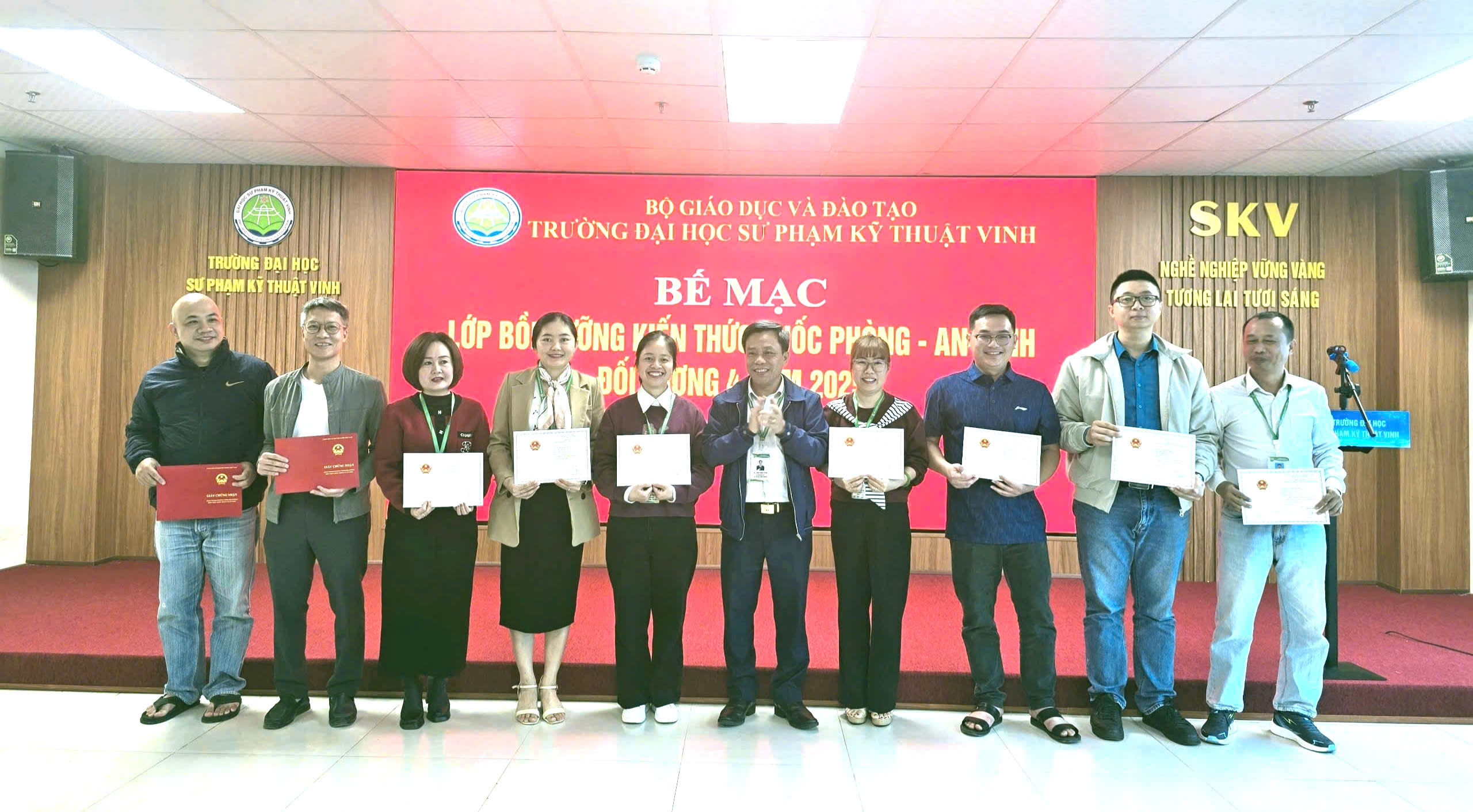Ngày 24/11/2025, Lễ bế giảng Lớp bồi dưỡng kiến thức Quốc phòng-An ninh đối tượng 4 cho viên chức Trường Đại học Sư phạm kỹ thuật Vinh đã được tổ chức . Đến dự buổi lễ bế giảng lớp học có TS. Thái Anh Tuấn – Bí thư Đảng ủy – Chủ tịch Hội đồng trường; TS. Phạm Hữu Truyền – Hiệu trưởng; TS. Thái Hữu Nguyên - Phó Hiệu trưởng Nhà trường cùng lãnh đạo các đơn vị và các cán bộ viên chức, giảng viên các báo cáo viên và học viên.